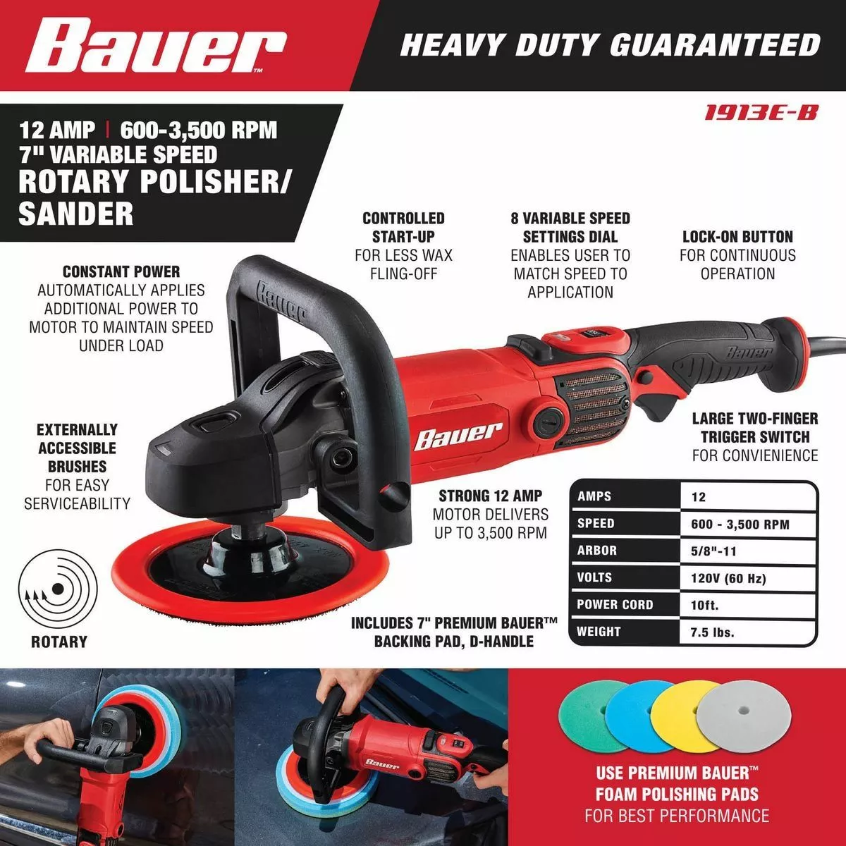 The BAUER™ 7 in. 12 Amp Variable Speed Rotary Polisher/Sander delivers 600 – 3500 RPM for smooth finishes. Eight variable speed settings adjust output precisely to match the type of work. The adjustable D-handle provides comfort and control in any position.