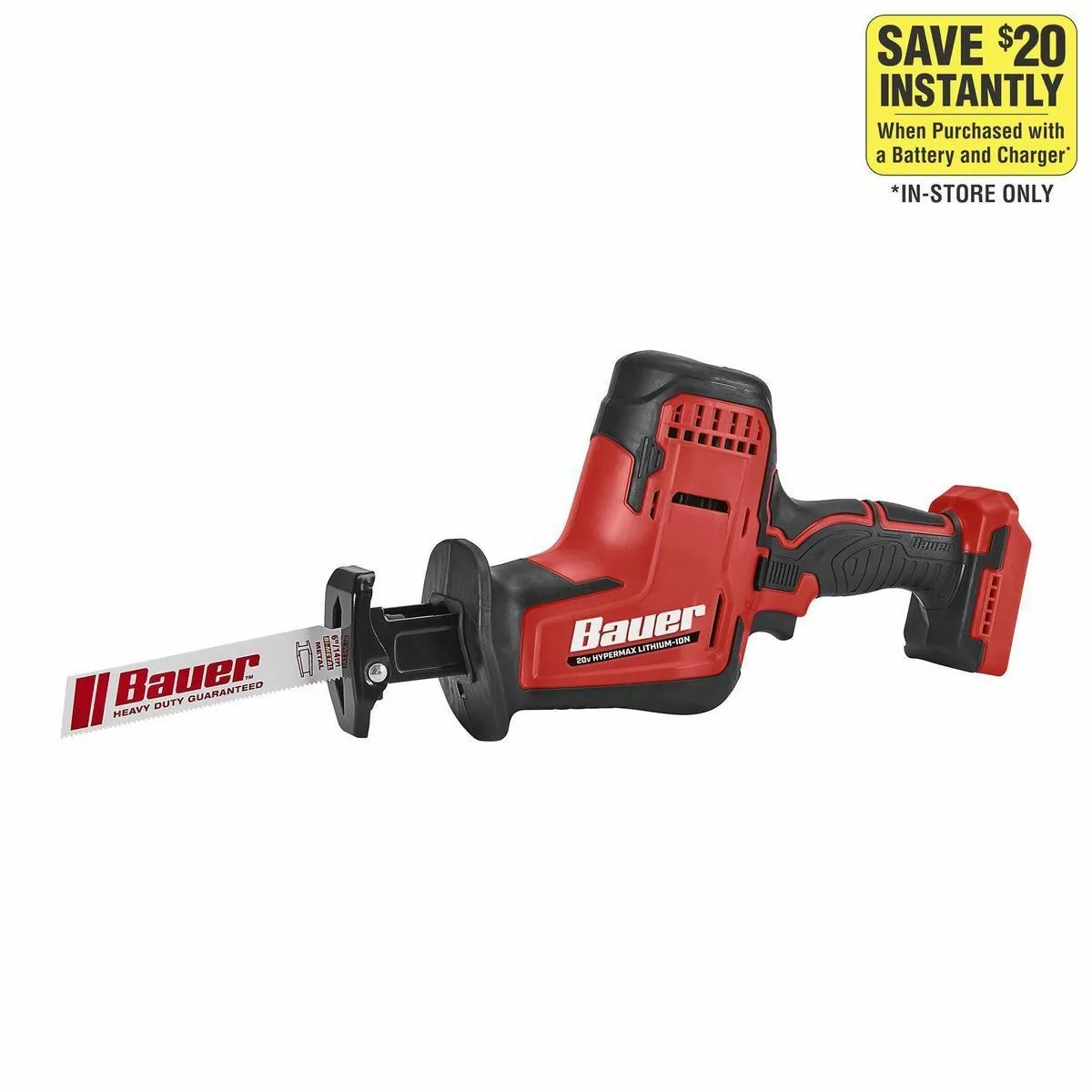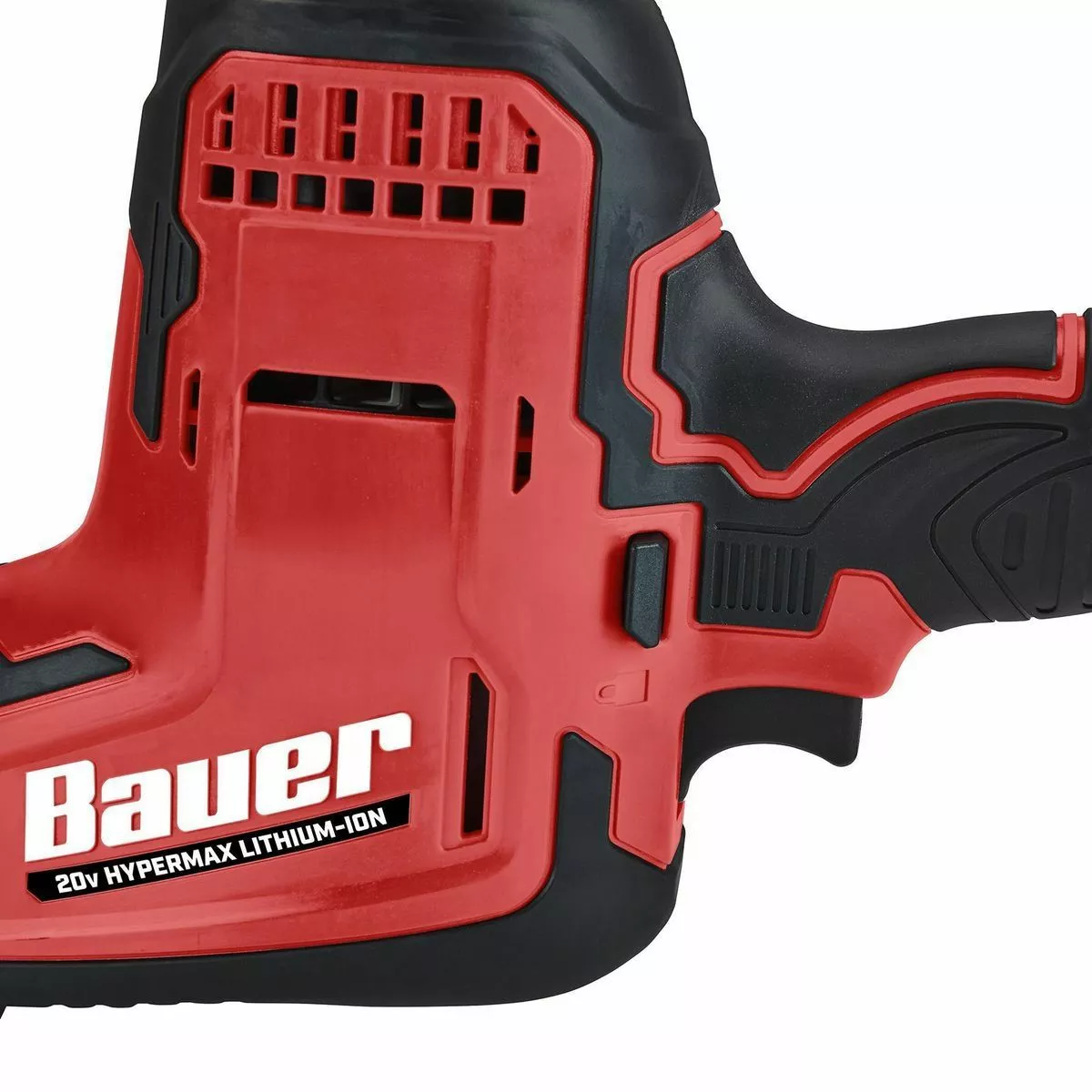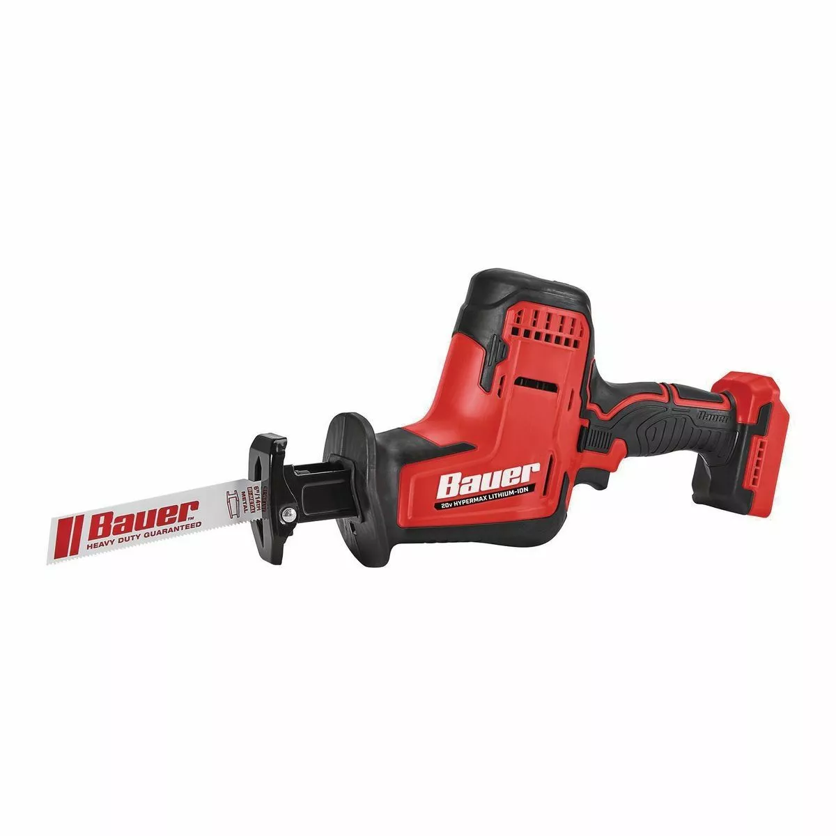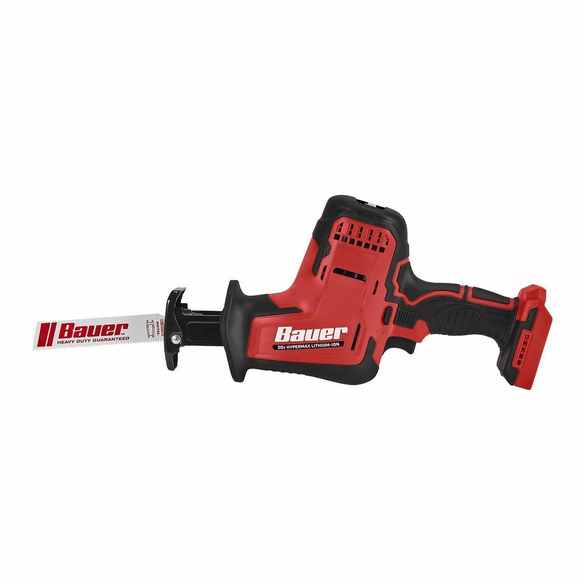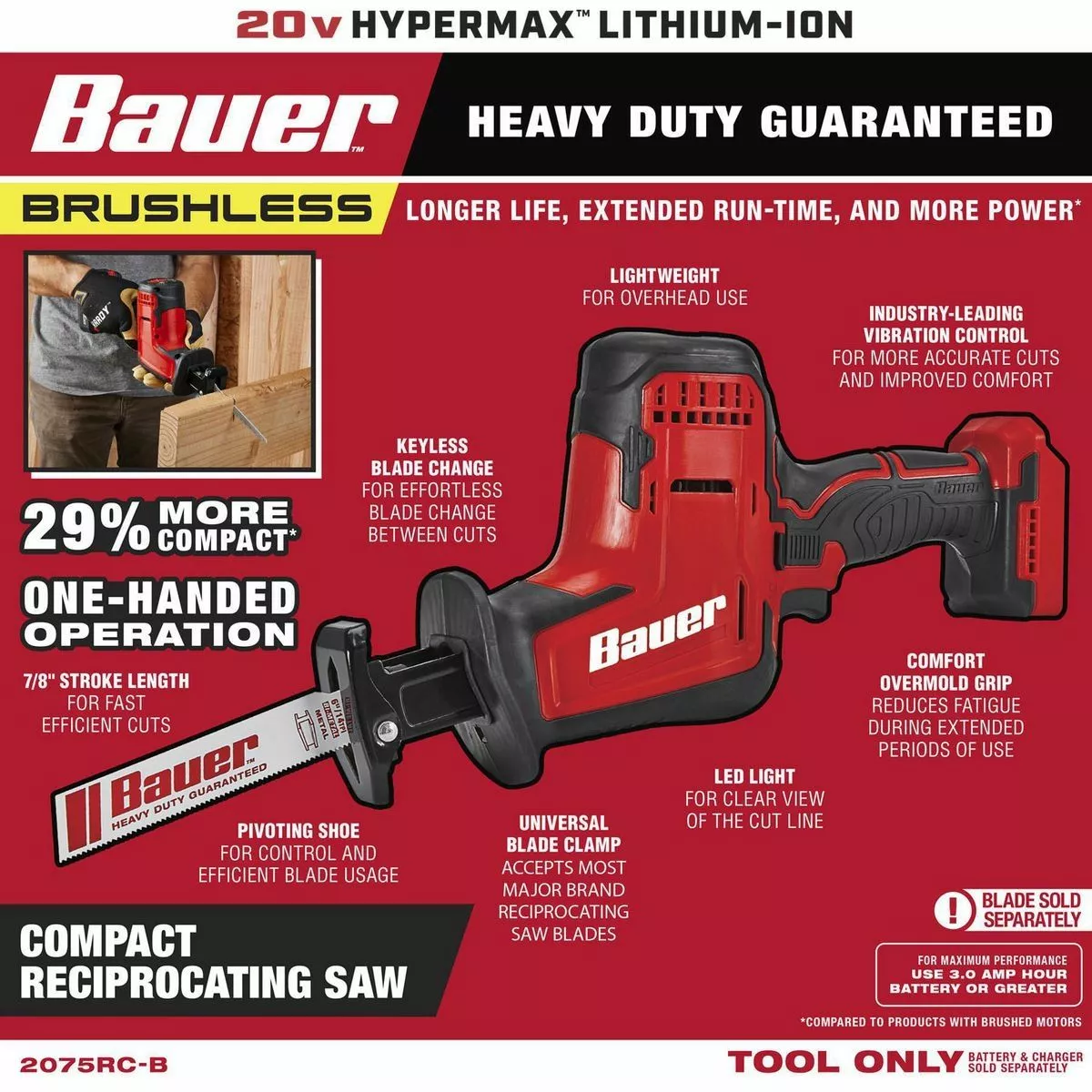 The BAUER™ 20V Brushless Cordless Compact Reciprocating Saw is 29% more compact* for easy one-hand use ideal for overhead cutting. This reciprocating saw uses brushless technology for longer tool life, extended run-time and up to 3000 SPM for the power to handle the toughest jobs. The 7/8 in. stroke delivers for fast, efficient cuts. The pivoting shoe provides cutting control in a variety of applications. Designed for keyless blade changes for less downtime between cuts.