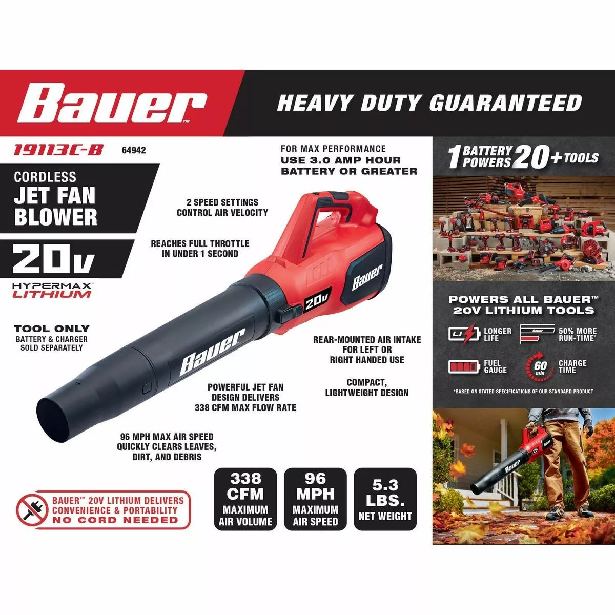 Powerful, lightweight and designed for performance, the BAUER™ 20v lithium cordless blower delivers optimal airflow for any application. Featuring a powerful 96 MPH airspeed for quickly clearing dirt, leaves and debris, 338 CFM max flow rate for optimal performance, 20V lithium-ion battery for extended life and an ergonomic, lightweight design for comfort and effortless operation.