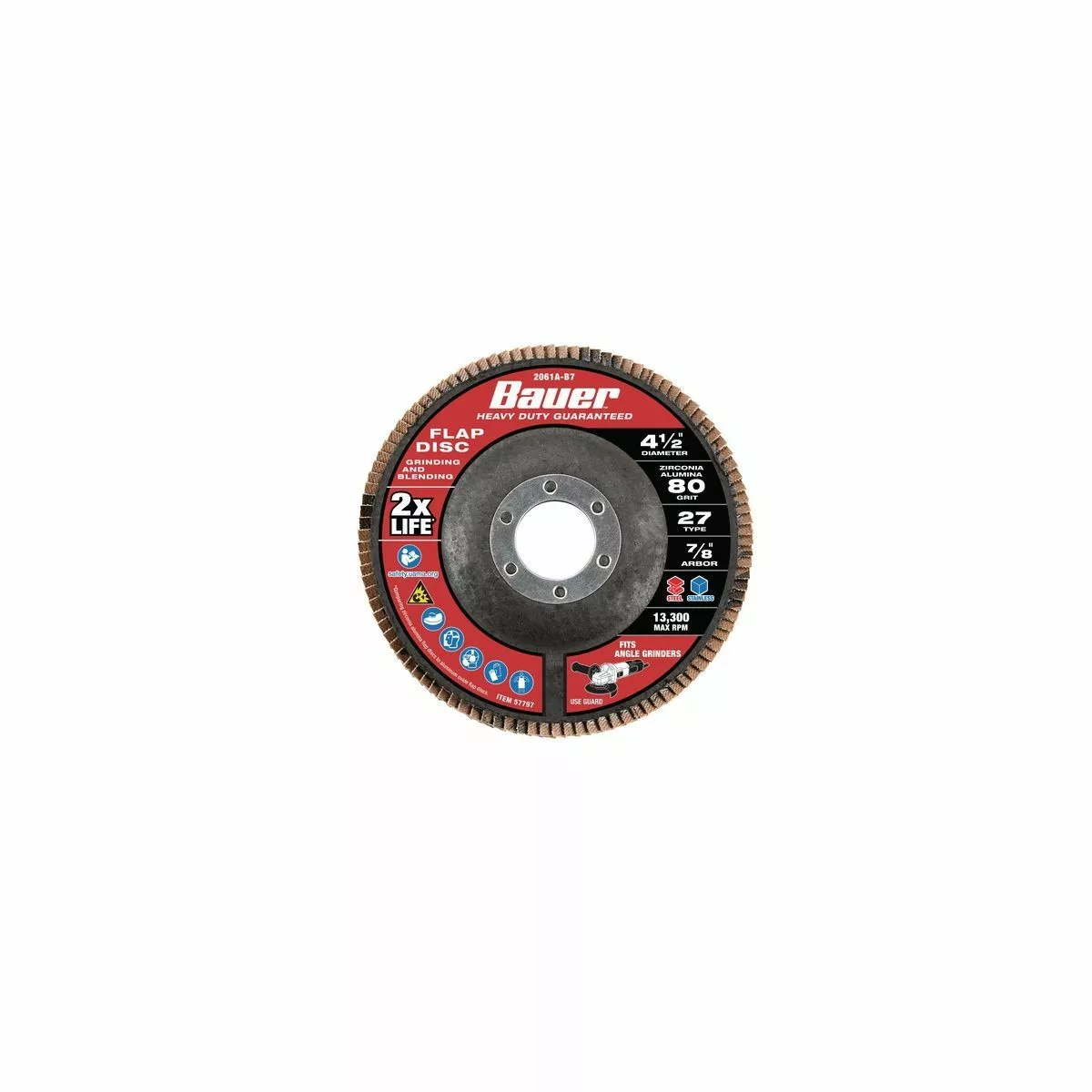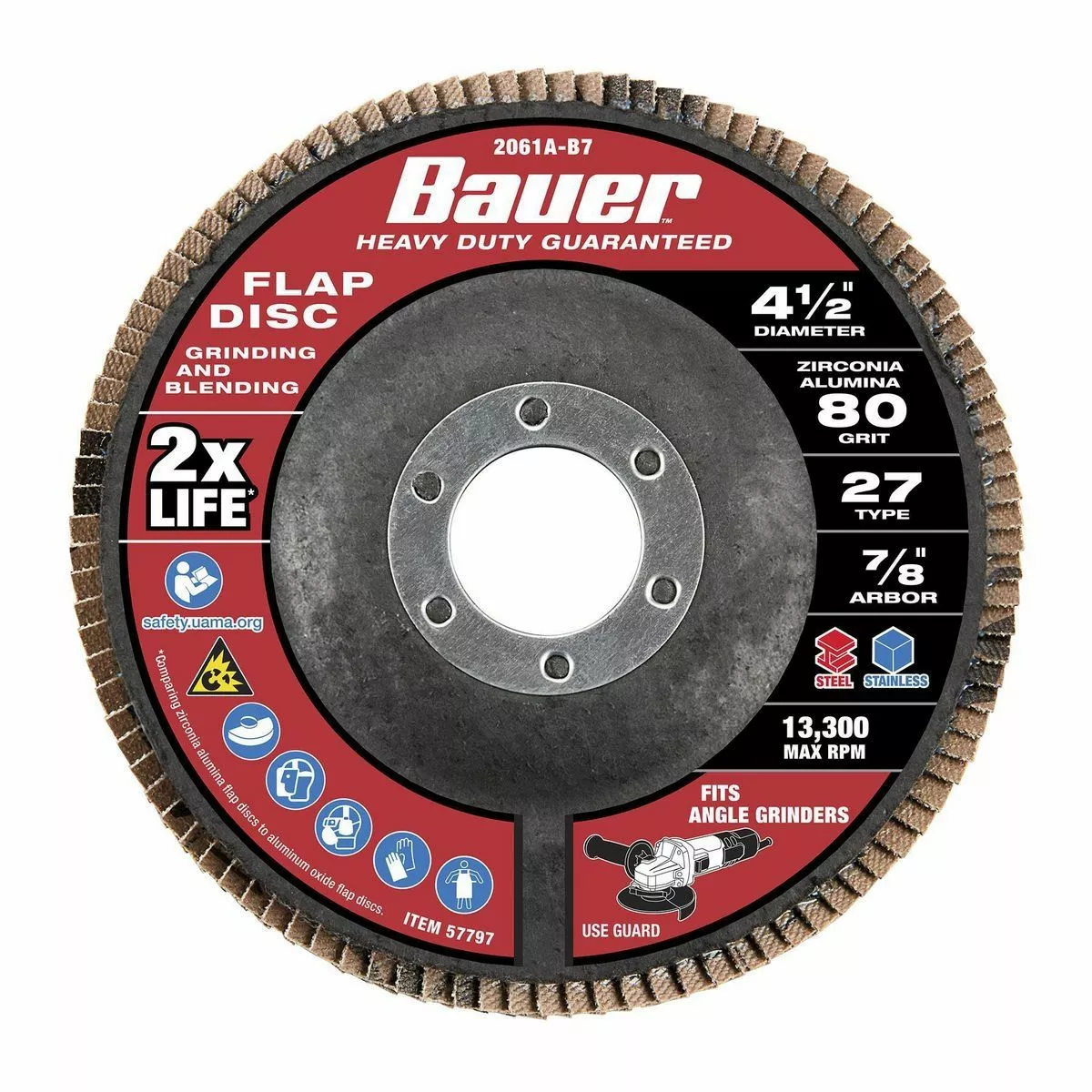 The BAUER™ 4-1/2 in. x 7/8 in. 80-Grit Type 27 Flap Disc is constructed with high quality Zirconia Alumina grain that lasts up to 2X longer* for fewer disc changes. Flexible flap plates conform to surfaces for grinding and blending on curves and contours. This disc delivers high performance on carbon steel and stainless steel applications.