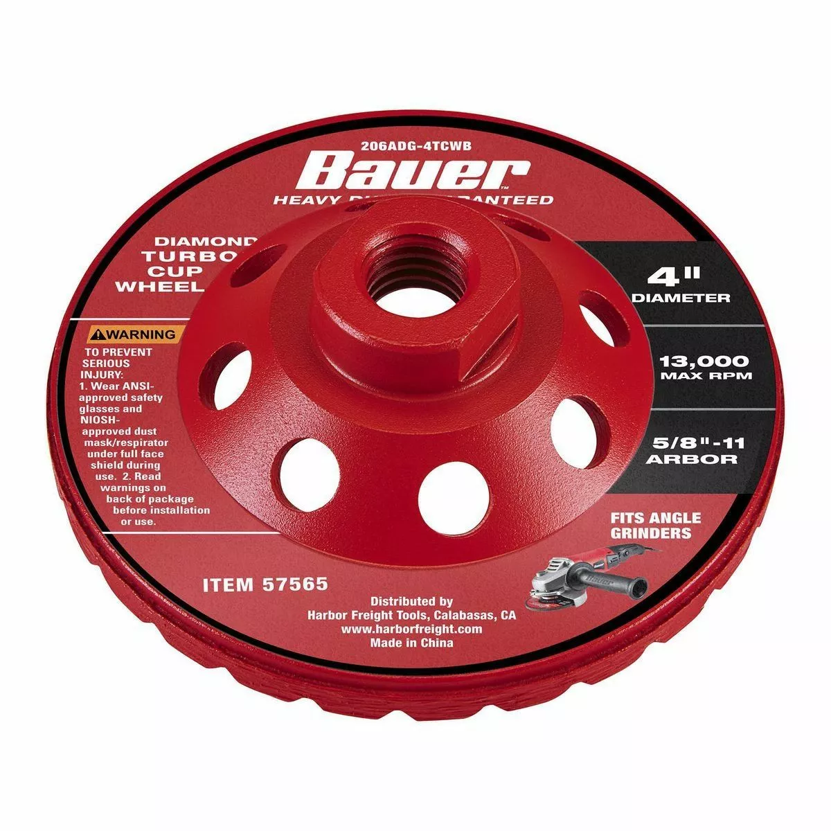 The BAUER™ Diamond Turbo Cup Wheel is designed for use with 4 in. angle grinders to power through project after project. This wheel is rated for a max speed of up to 13,000 RPM to handle demanding grinding and leveling jobs. Can be used with a dust shroud for cleaner work environment.