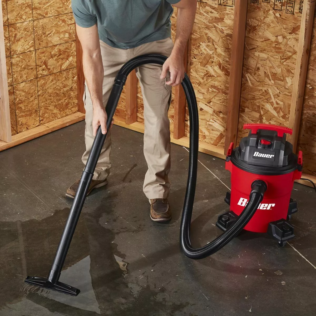 The BAUER™ 6 gallon wet/dry vac delivers 4 peak horsepower** of powerful suction for cleaning up liquids and spills. This wet/dry vac is designed with an ergonomic top carrying handle for maximum comfort, a convenient cord wrap for storing the 10 ft. power cord, ultra flexible, kink resistant 7 ft. hose for uninterrupted use and portable, lightweight design ideal for shop and home use. Includes convenient on-board storage for keeping accessories organized and easy access all in compact design that’s easy to store.