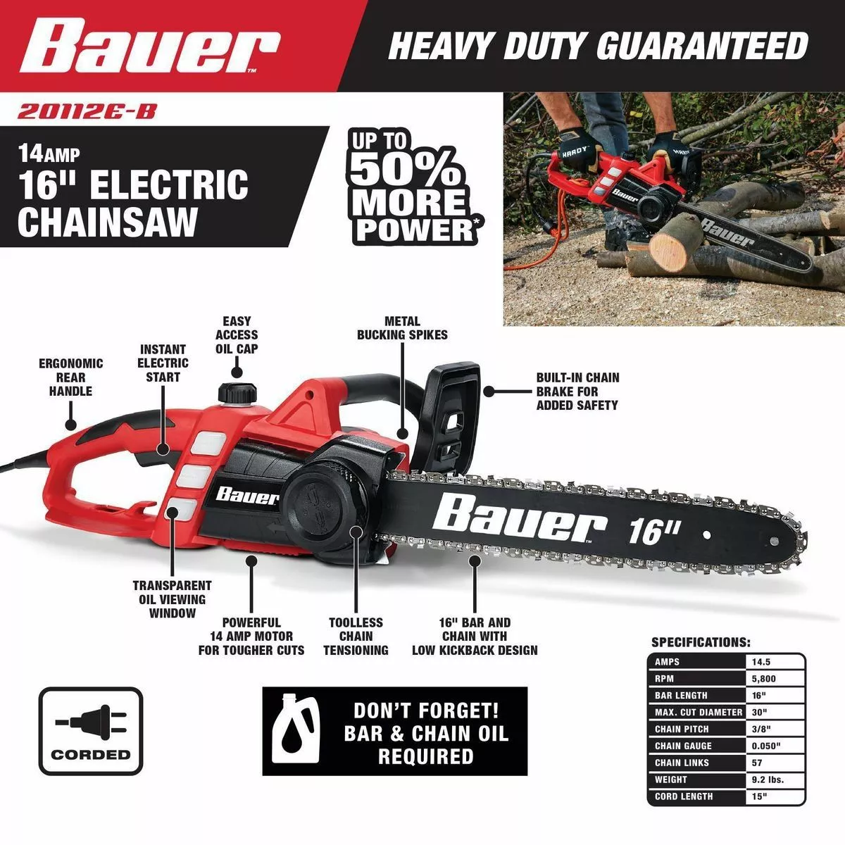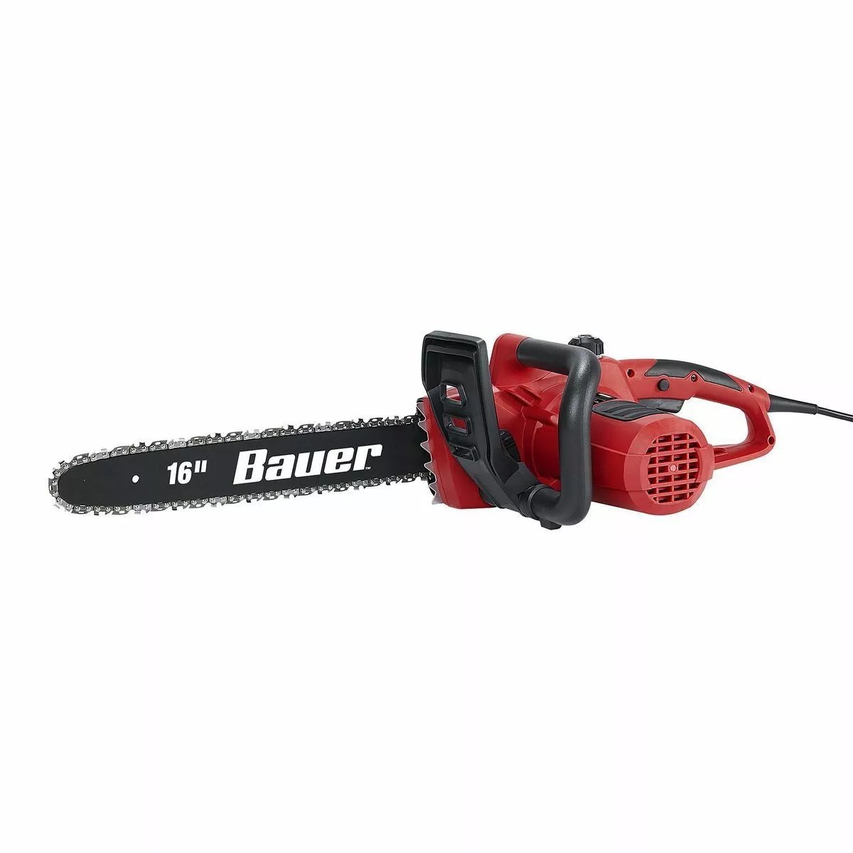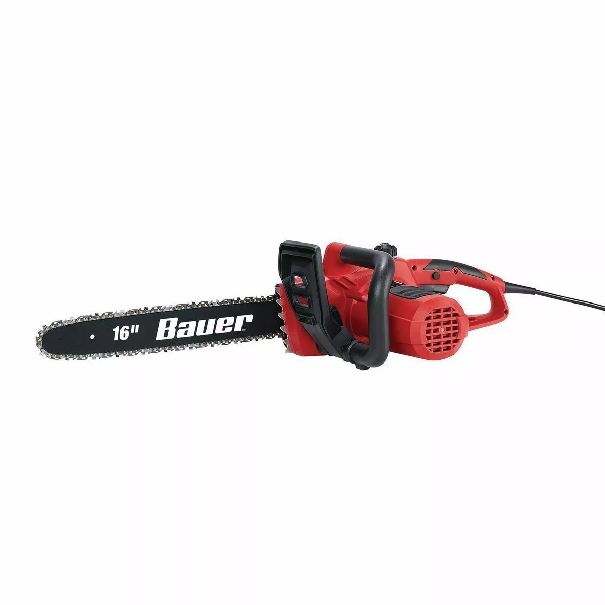 The BAUER™ Corded Electric Chainsaw is designed to deliver up to 50% more power* for tough cuts. This chainsaw is designed with a low-kickback 16 in. bar and chain ideal for trimming, pruning, and limbing. Additional features include easy access toolless chain tensioning, automatic chain oiler with transparent viewing window, and ergonomic rear handle.
