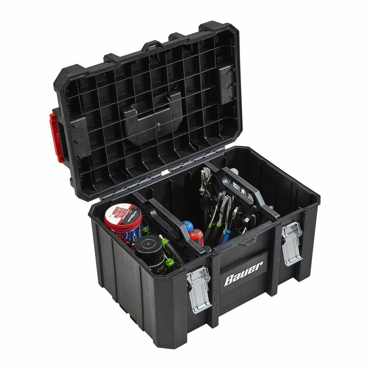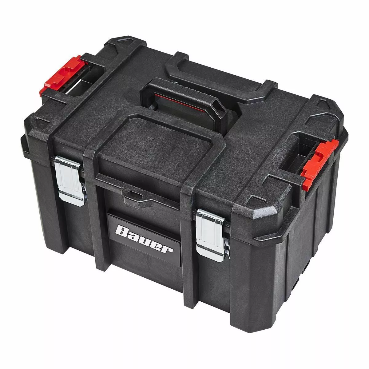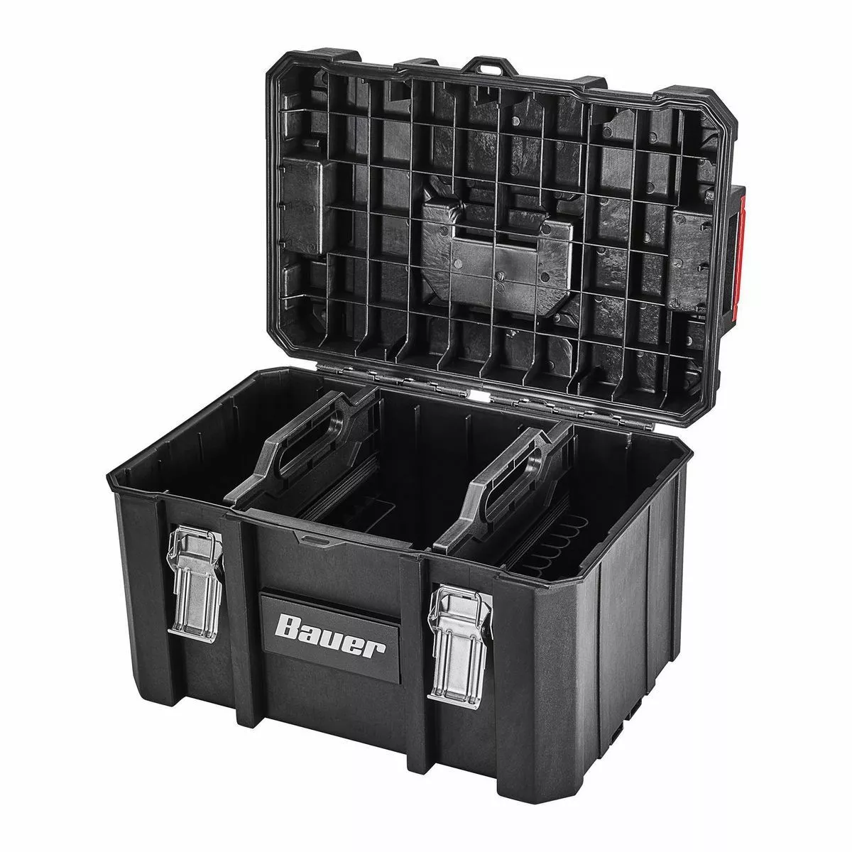 The BAUER™ Large Modular Toolbox is ideal for organizing tools. Made from high-impact resin, this toolbox has removable tool cards for organizing pliers, screwdrivers, and more. Strong metal latches keep tools secure during transport. With a 50 lb. weight capacity this toolbox is fully compatible the BAUER™ Modular Storage System. The organizer is IP65 rated for dust and water resistance. Customize your storage for quick access to essential tools.